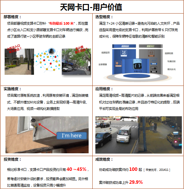常规卡口一般架设在城市的各级公路上,对省际、市际、城市主干道的车辆能够进行准确抓拍并对车辆信息进行记录,能够在整个城市中形成三道包围圈,但在支路、小路、居民小区等地方又很少有卡口建设。天网卡口的出现解决了这一难题,能够将目标车辆和人员锁定在居民小区最后100米。
